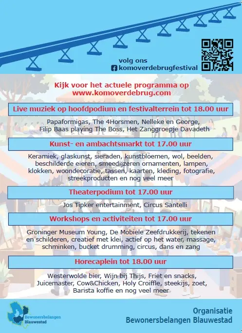 Kom over de brug Festival wordt door “Bewonersbelangen Blauwestad “ georganiseerd, hierna verder te noemen ‘organisatie ‘