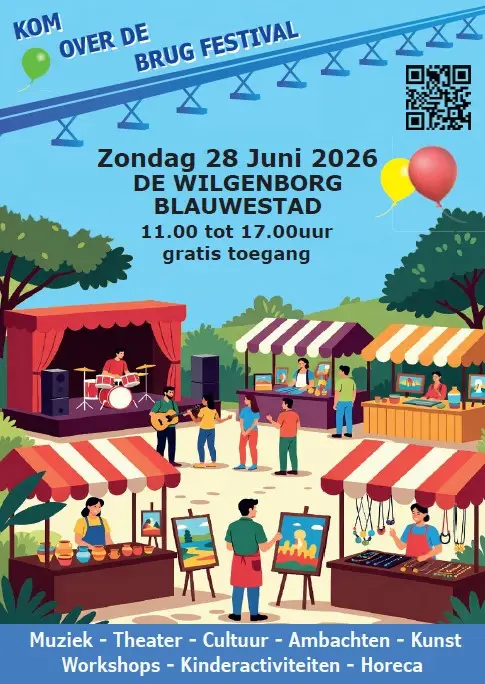 Het Kom over de Brug Festival is een eendaags kunst- en muziekfestival en is een dag die verbinding maakt tussen beeldende kunst, cultuur, entertainment, ambacht, ambachtelijk geproduceerd voedsel en ons cultureel landschap. Maar ook een dag van verbinding tussen Blauwestad en de omliggende regio. De Wilgenborg en omgeving worden omgetoverd tot één groot atelier, waar kunstenaars werken en waar je workshops kunt volgen en kunt genieten van live muziek en lekker eten. Er is een horeca-plein en kidsplein met veel activiteiten. De eerste editie in 2024 was een enorm succes en trok ruim 3000 bezoekers.